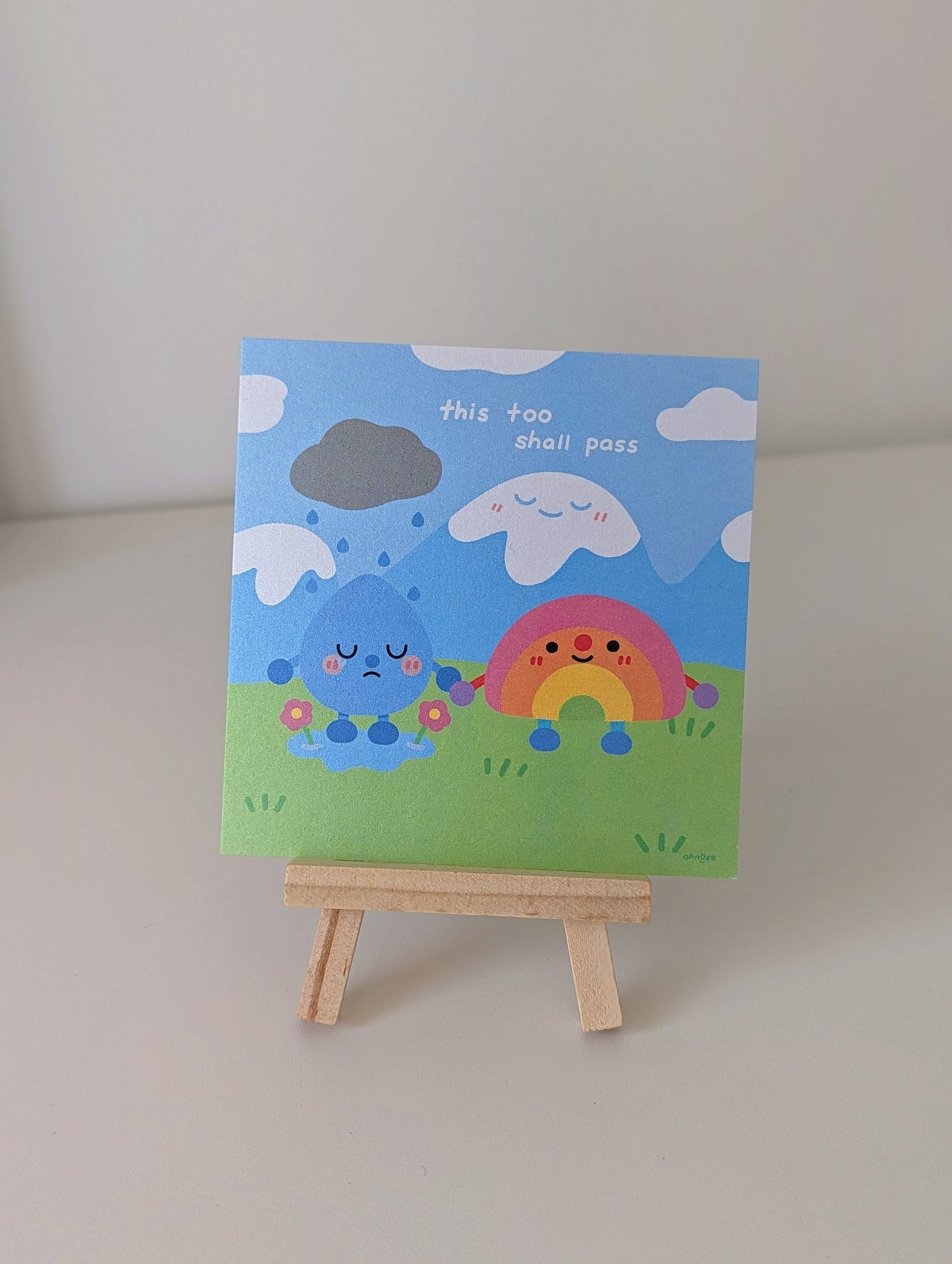 This Too Shall Pass 4x4" MINI Shimmer Art Print / Rainbow and Rain Holding Hands, Gentle Mental Health Reminder